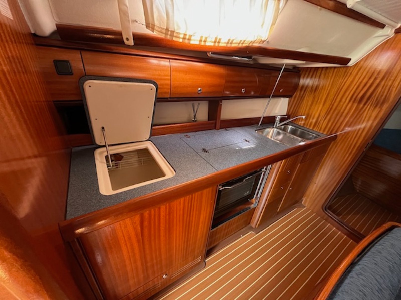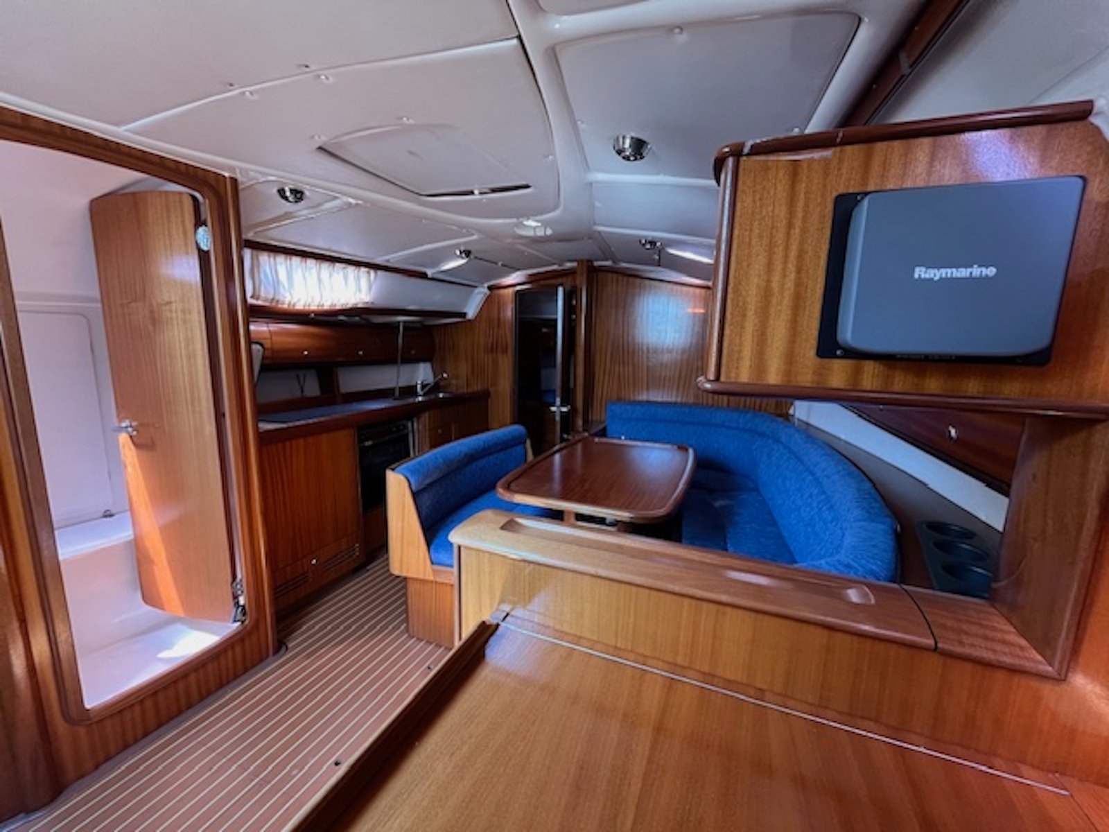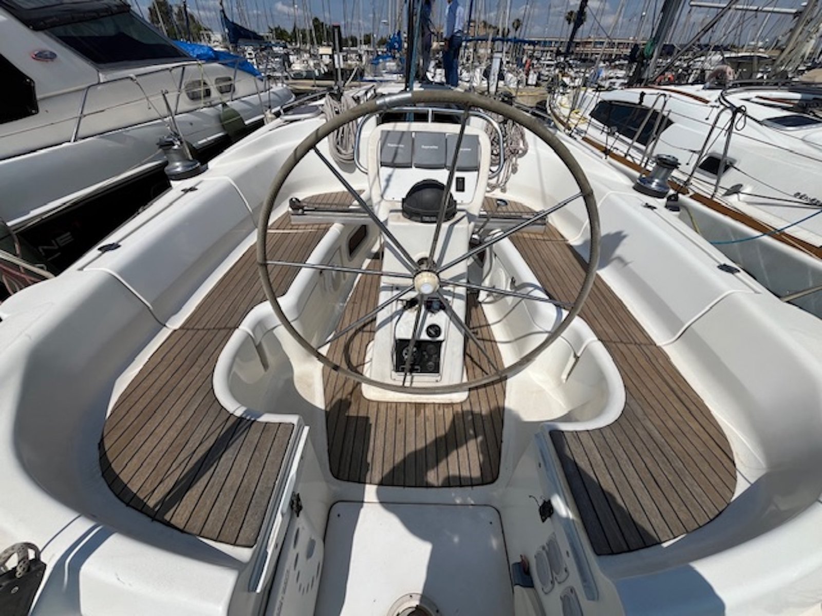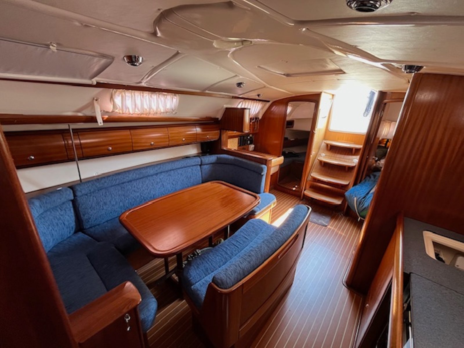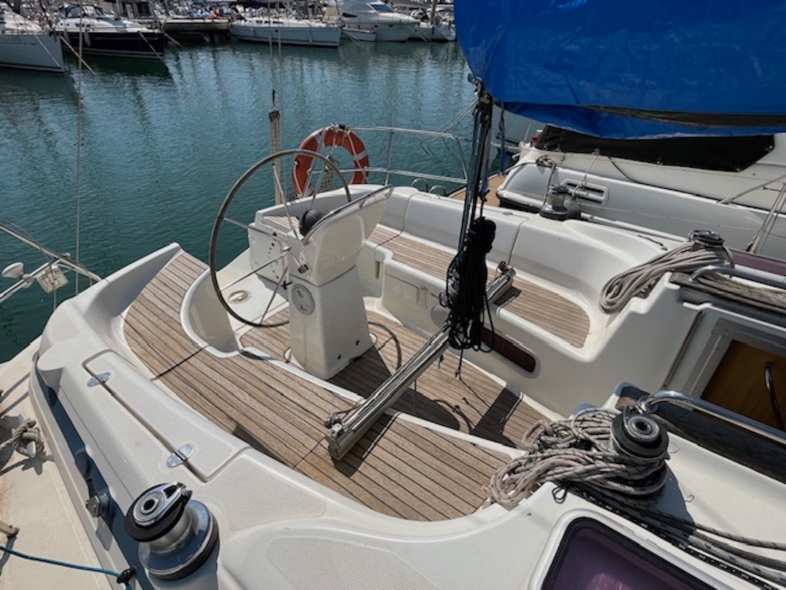| Cubierta | 6 winches Molinete Lofrans 1000W, con fondeo completo Ducha de bañera Escalera de baño Colchonetas de bañera Bimini Toldo de cubierta Teca en bañera, tratamiento 2019. Lona fondeo Funda rueda en piel Funda de bitácora Acastillaje de cubierta HARKEN y SPINLOCK. Botalón de proa inox. Carro escota mayor FREDERIKSEN en bañera, desmontable |